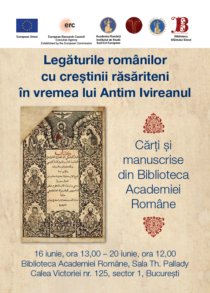 Vă invităm luni, 16 iunie, la ora 13,00, la vernisajul expoziției „Legăturile românilor cu creștinii răsăriteni în vremea lui Antim Ivireanul. Cărți și manuscrise din Biblioteca Academiei Române”, organizată de echipa proiectului TYPARABIC (coordonat de dr. Ioana Feodorov și găzduit în Institutul de Studii Sud-Est Europene), în colaborare cu Biblioteca Academiei Române și cu Biblioteca Sfântului Sinod al Patriarhiei Române. Expoziția este găzduită la Biblioteca Academiei Române, Sala Th. Pallady, în perioada 16-20 iunie 2025.